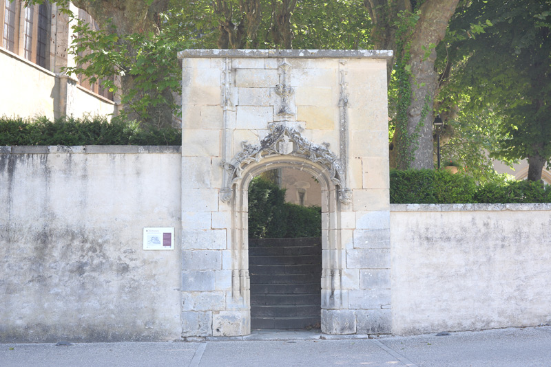Cette porte Renaissance est tout ce qui reste du logis de l’abbé, démoli à la Révolution. Elle s’ouvre dans le mur et par quelques marches, permet d’accéder à une grande cour, utilisée aujourd’hui comme parking. Elle n’était pas à cet endroit initialement. C’est l’ancienne porte du réfectoire des moines, placée là au XIXe siècle